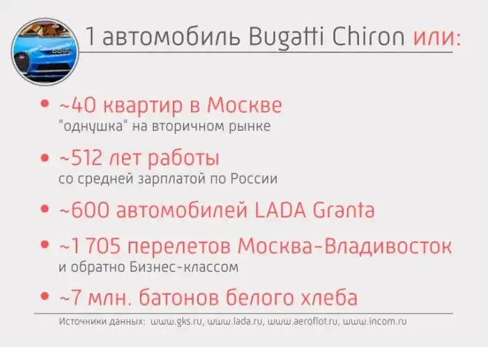 На Московском автосалоне посетителям показали выставочный вариант французского гиперкара Bugatti Chiron. Автомобиль, который выпустят ограниченным тиражом в 500 экземпляров, оценили в 220 миллионов рублей, сообщает Вести FM. Такой дорогой машину делает российская расстаможка, в то время как в Европе Chiron стоит 2,5 миллиона евро, что на один миллион дешевле. Стоит отметить, что ездить на таком авто сразу после покупки по дорогам России не получится, так как его сперва придется оборудовать системой экстренного оповещения «ЭРА-ГЛОНАСС». Позволить себе покупку 1500-сильного гиперкара, разгоняющегося до 100 км/ч за 2,5 секунды и далее максимум до 420 км/ч, смогут лишь мультимиллионеры. И пока кто-то обдумывает варианты покупки этого авто, журналисты уже подсчитали, что еще можно купить за эту рекордную для российского авторынка сумму.