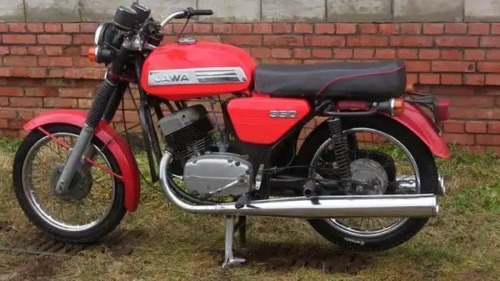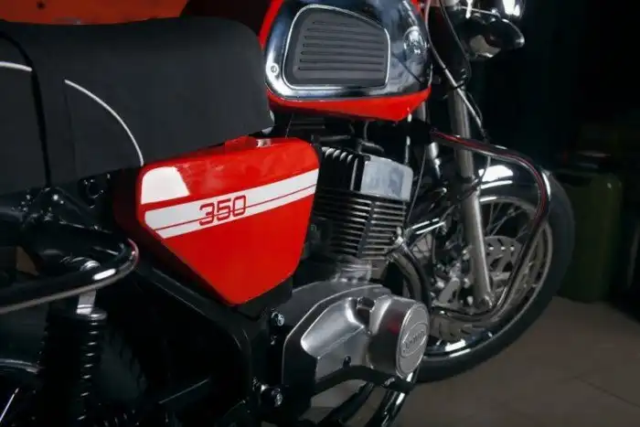Почти такой же как в 70-х мотоцикл, с тем же 2-тактным двигателем и с теми же "фишками". Внешний вид мотоцикла взят от Jawa 350 634/7, а двигатель тот же, что и у модели Jawa 350 640.