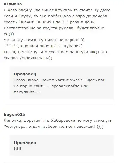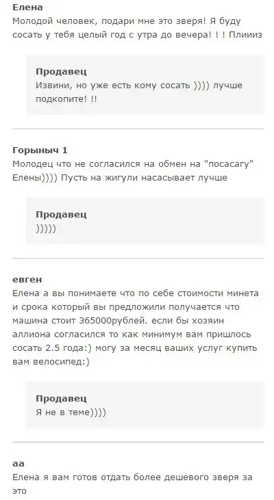 Блин, Лена, сам на год обеспечить тебе работу не смогу,в моем возрасте круглосуточно давать сосать целый год одной даме не смогу, может договоримся,что в перерывах будешь дарить радость моим друзьям? Реально бэху свою подарю, но друзей много...