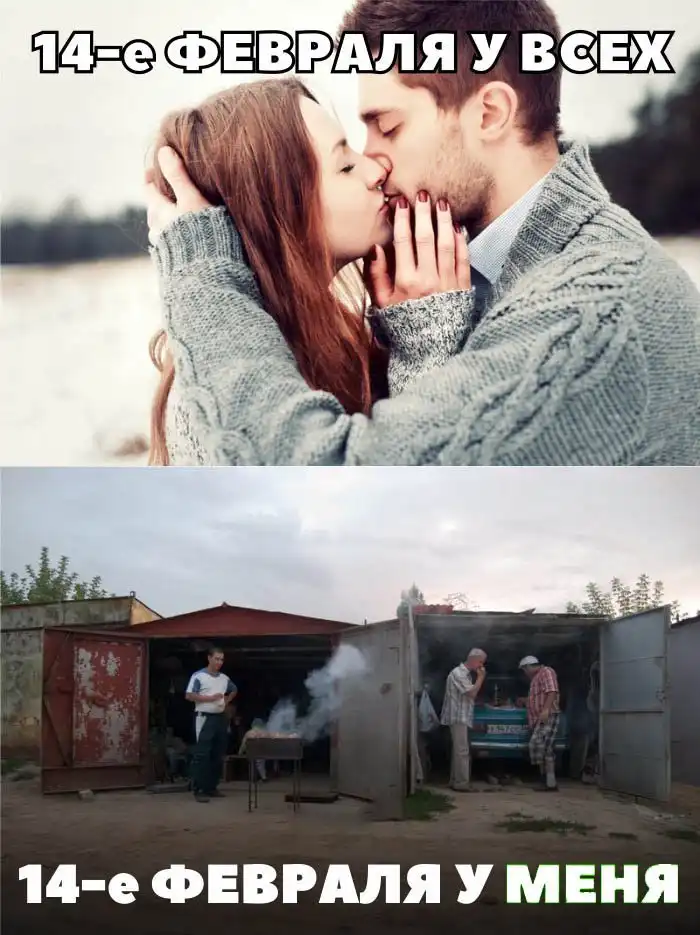 странное у чувака 14 февраля! на улице трава,мужики в рубашках с коротким рукавом-календарь попутал или снег у гаража хорошо почистил?