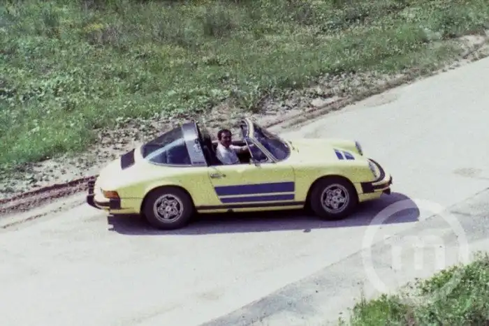 Однако, «уазик» и березки на заднем плане следующего же кадра на пленке уже не оставляют вопросов о месте съемки! Фото сделано в 1977 году, «мафиози» за рулем – испытатель Анатолий Анахин, а сама машина не случайно имеет желто-синюю окраску, рупоры под бампером и кронштейны на боковых стойках: этот 911-й – в милицейском исполнении! Сразу после полигонных испытаний, проведенных сотрудниками завода АЗЛК, Porsche заступил на дежурство в московском ГАИ!