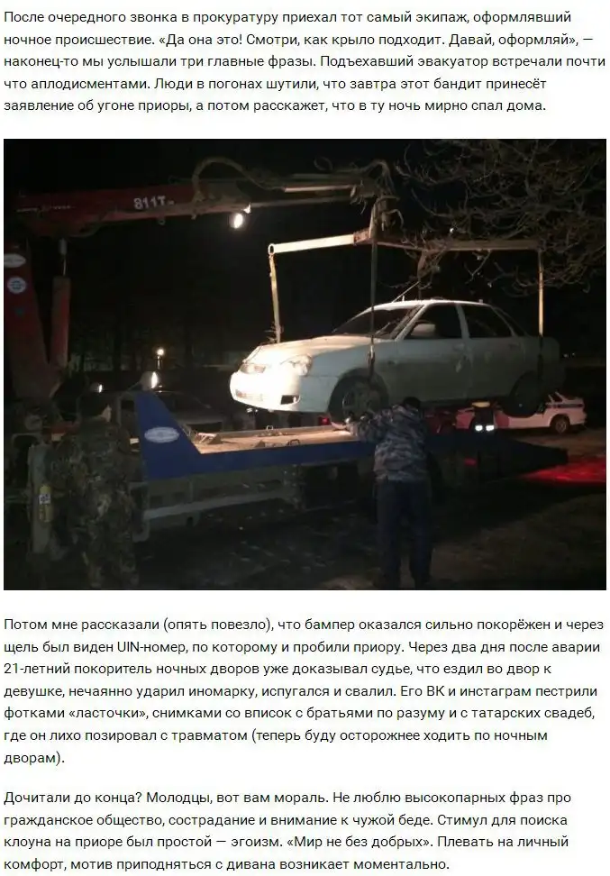 Фрилансер Андрей Ставицкий рассказал историю о том, как с помощью интернета ему удалось найти лихача на «Приоре», который скрылся с места ДТП. Этим простым методом для повышения раскрываемости дел не мешало бы воспользоваться и сотрудникам правоохранительных органов.