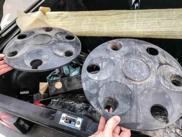 Запаска — под капотом. Обратите внимание на оригинальную конструкцию колесного диска