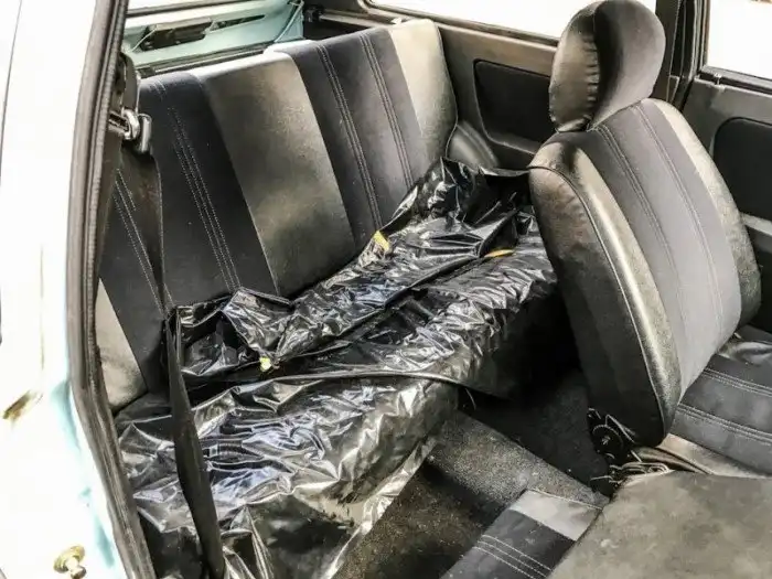 На задних сиденьях еще сохранились заводские полиэтиленовые накидки