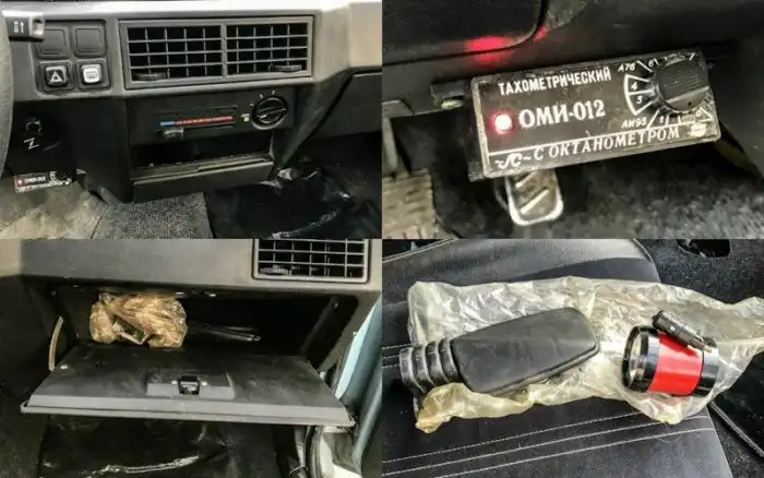 Штатной автомагнитолы здесь нет, зато под рулевой колонкой установлен октан-корректор, а в бардачке нашлось правое наружное зеркало заднего вида и фонарик