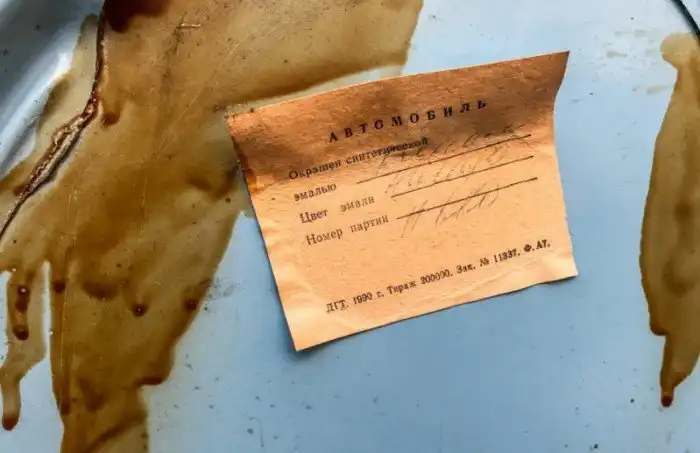 Неизменный атрибут аутентичных советских машин с малым пробегом — бумажная бирка с названием краски. Эта сохранилась превосходно