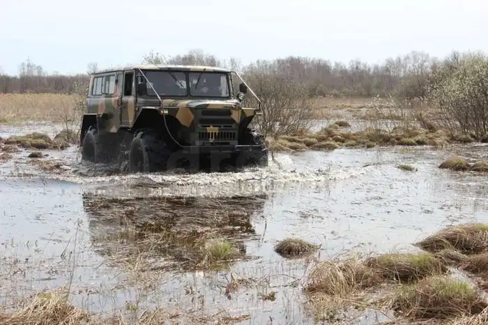 Перед вами кастомный внедорожник повышенной проходимости, построенный на базе грузовика ГАЗ-66. Автомобиль создавался специально для пересеченной местности и труднопроходимых районов, поэтому он может преодолевать не только водоемы и высокие сугробы, но даже болота. Стоит отметить, что это уже четвертый аналогичный вездеход, в котором учтены и устранены все ошибки предшественников. Автомобиль оснащен большими широкими колесами и мощным двигателем, позволяющим ему быстро передвигаться по трассе, выезжать на которые ему разрешают все необходимые документы. Прежде всего, авто создано для любителей выезжать большой компанией на рыбалку или охоту. Стоимость такого вездехода составляет 1,2 миллиона рублей.
