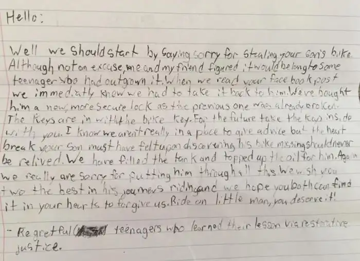 На седле мотоцикла была обнаружен записка с текстом: "Конечно, это не лучшее оправдание, но мы с друзьями подумали, что мотоцикл принадлежал подростку, который уже его перерос. Когда мы прочитали ваш пост, мы сразу же решили вернуть его. Мы понимаем, что не нам раздавать советы, но мы понимаем, как сильно ваш сын переживал из-за утраты. Мы наполнили бак бензином и залили масло. Ещё раз, нам очень жаль, и мы надеемся, что вы сможете нас простить". Письмо было подписано следующими словами: "раскаивающиеся подростки, которые получили свой урок".