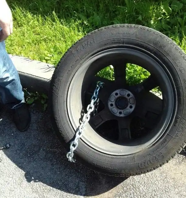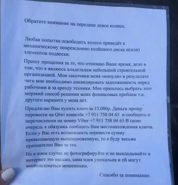 Жительница Санкт-Петербурга, оставившая свой автомобиль ночевать во дворе одного из домов на Пулковской улице, наутро обнаружила на диске "сюрприз" в виде цепи. Цепь была скреплена замком, а на машине лежало послание от мошенника, просившего за ключ 15 000 рублей. Разумеется, денег мошенник не получил, а проблему решили снятием колеса и обрезкой цепи с помощью болгарки.