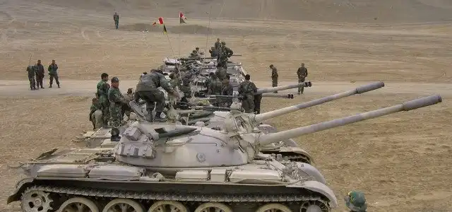 Два танка Т-54 афганской армии готовятся к бою при Ургуне в провинции Пактиа в 1985 г. Машина слева