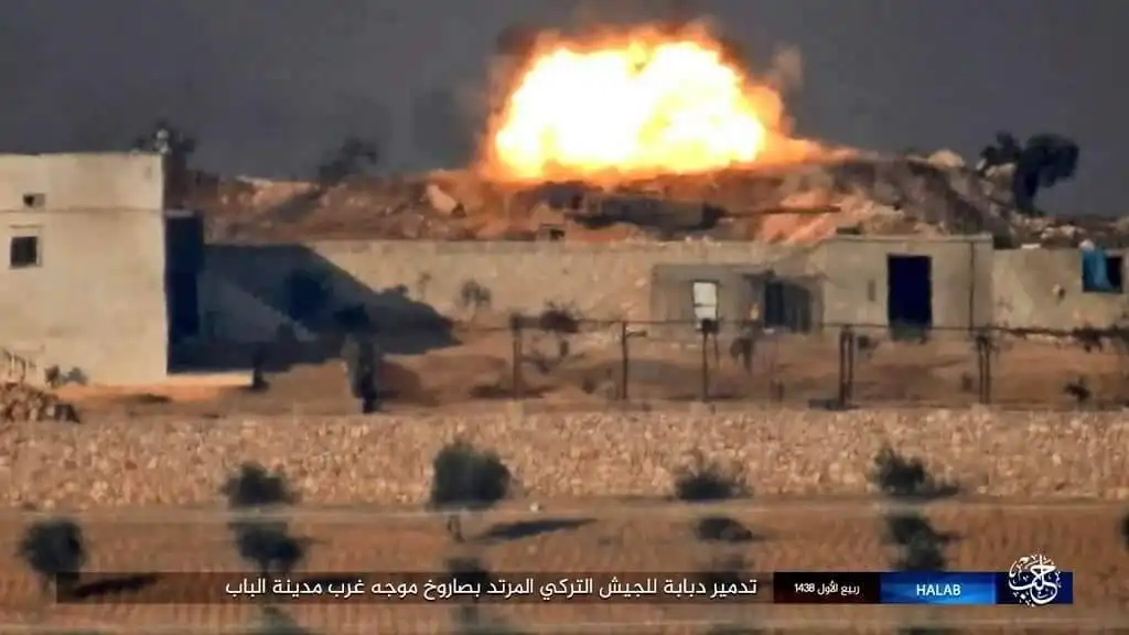 Вскоре «информационное агентство» террористов отчиталось об очередных достижениях группировки. Утверждалось, что в ходе боев за г. Эль-Баб террористы смогли отбить у турецкой армии танки «Леопард-2». Опубликованные фотографии показывали, что Турция потеряла не менее двух машин этого типа, а также некоторое количество другой материальной части. Любопытно, что даже через полгода так и не появились сообщения об эксплуатации таких танков подразделениями террористов, которые ранее достаточно активно применяли трофейную бронетехнику других типов.