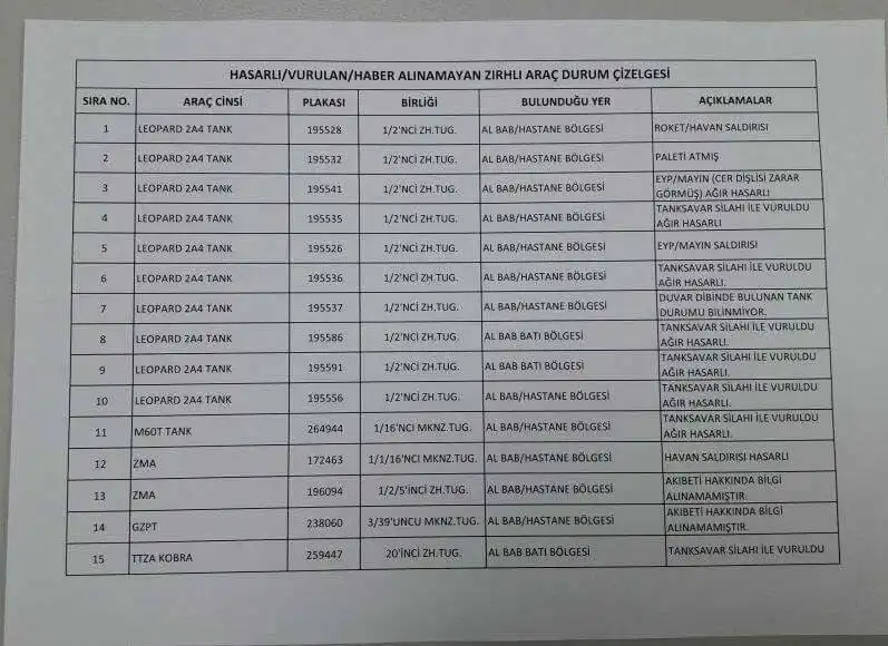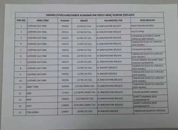 Таблица с информацией по потерям техники армии Турции во время сражения при Эль-Бабе.