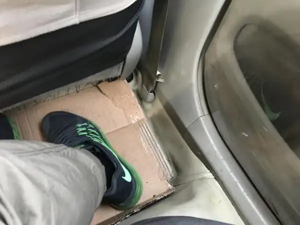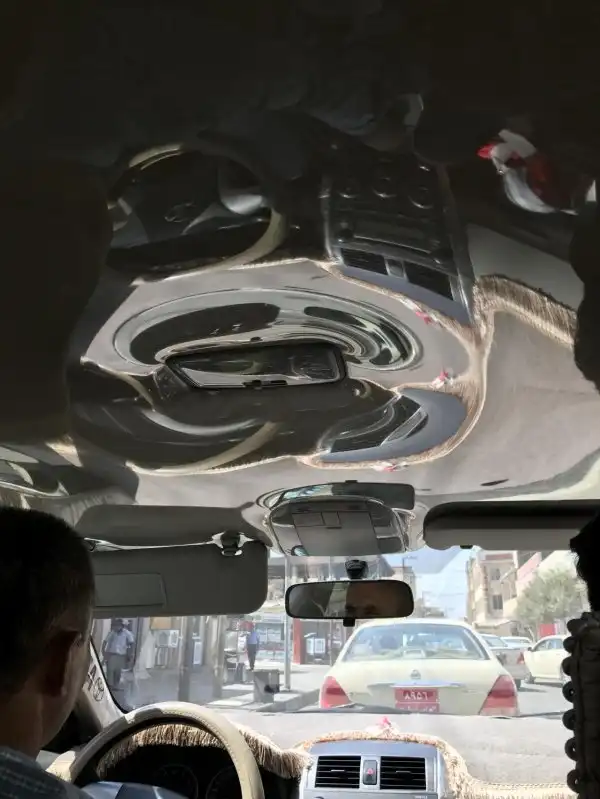 Но один водитель багдадского такси, похоже обошел всех. И это уже не связано с начальными наклейками в дилерском салоне. Специальной пленкой обтянут весь салон автомобиля. Даже потолок не избежал этого странного тюнинга.