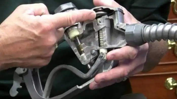 На деле все работает без помощи электроники — и в том числе поэтому механизм так надежен. Суть в том, что кроме основного клапана (который открывается нажатием на рычаг) внутри пистолета есть дополнительный клапан с мембраной. С носика пистолета к этому клапану идет очень тонкий т.н. вакуумный или сигнальный канал. Мембрана «взводится» в момент нажатия на рычаг — и находится в этом «взведенном» состоянии, пока через вакуумный канал проходит поток воздуха. Канал заканчивается внутри пистолета, в районе основного клапана, — и поток бензина, проходя мимо этого отверстия на большой скорости, создает в канале разрежение. Это разрежение заставляет отверстие на носике пистолета засасывать воздух из топливного бака.