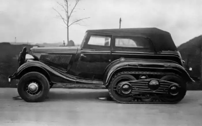 В Советском Союзе полугусеничные грузовики выпускались серийно. В большинстве случаев это были тягачи и грузовики, однако пытались конструировать и легковые гусеничные модели. Вот этот, например, был сделан на базе автомобиля ГАЗ-М1.