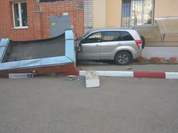 Массивный козырёк одного из подъездов многоэтажного дома на улице Оршанская д. 9 рухнул, раздавив припаркованный около входа автомобиль.