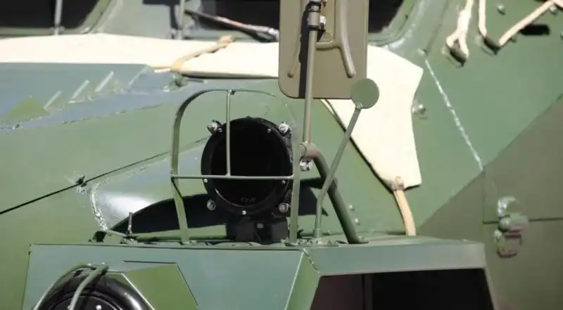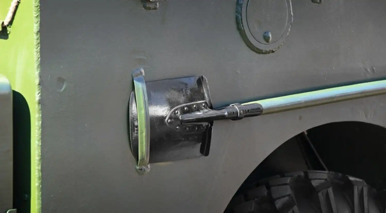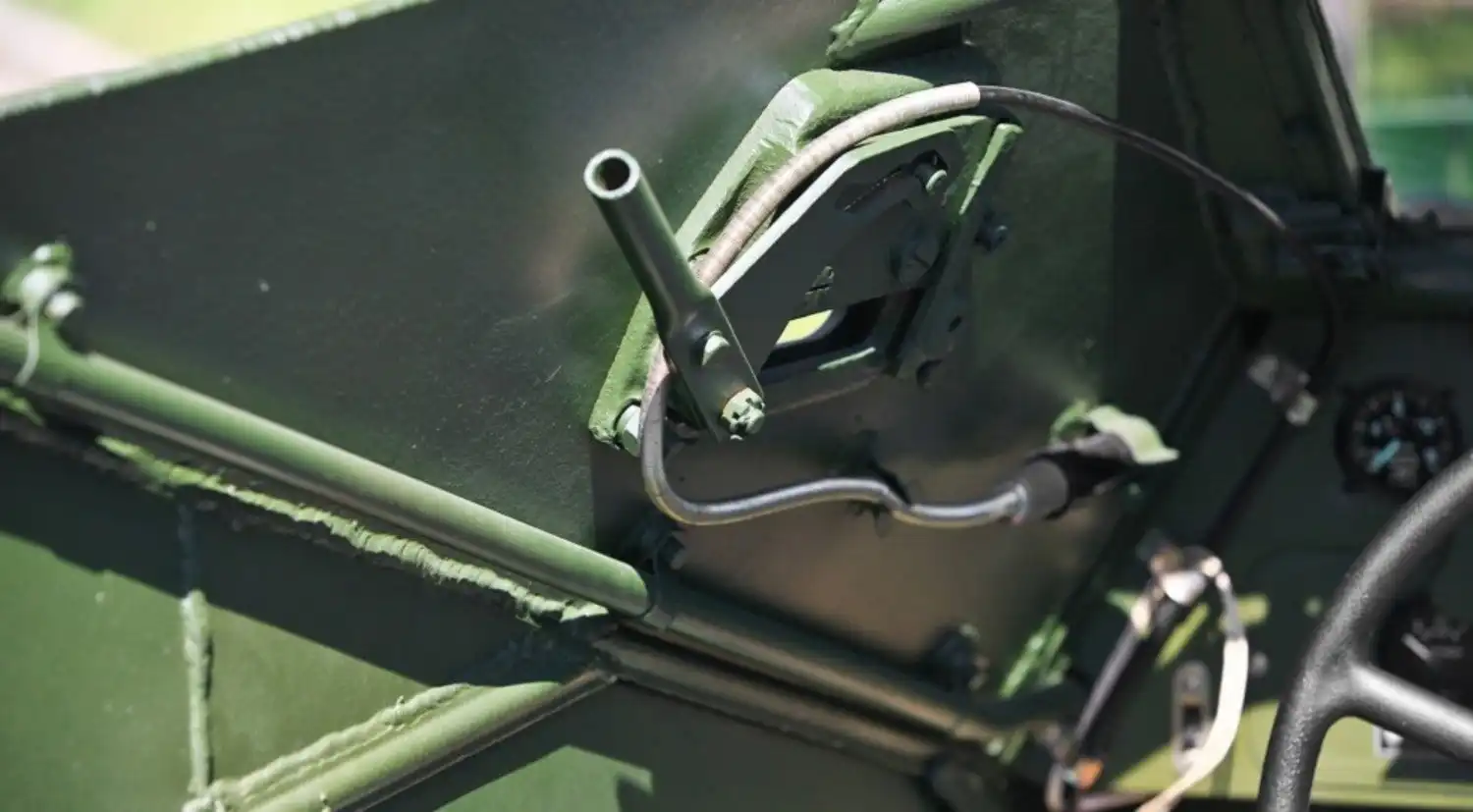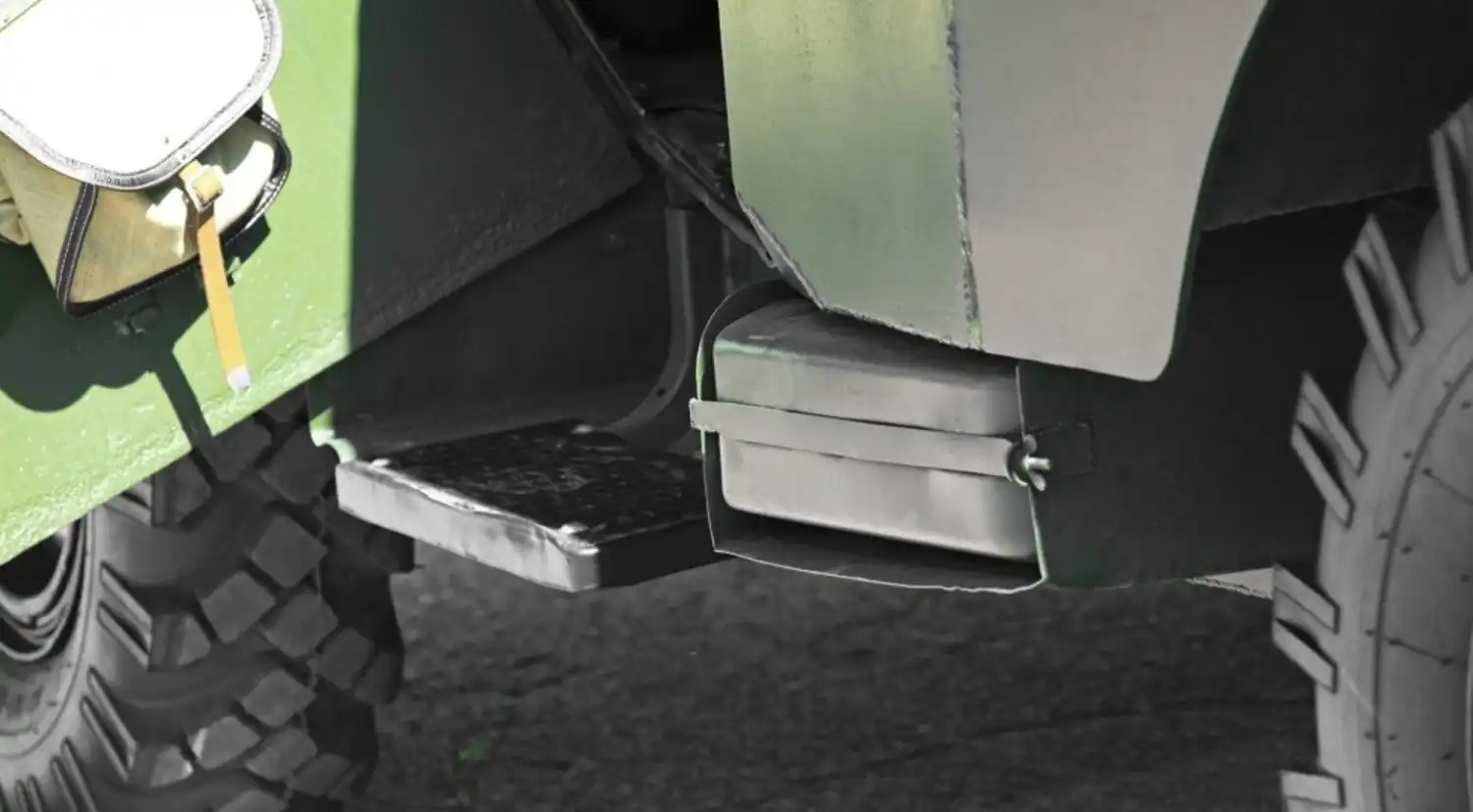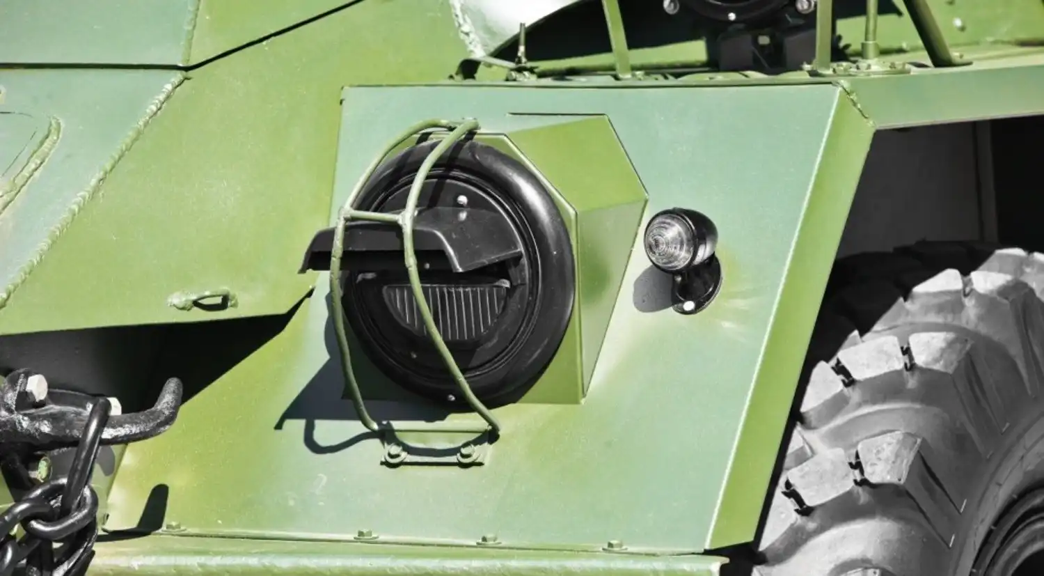 Для связи с войсками командиру полагается радиостанция Р-113, короб которой разместился перед командирским сиденьем. Штатно БТР комплектовался пулеметом Горюнова калибром 7,62 мм, которым экипаж мог успешно отбиваться как от низколетящих воздушных целей, так и вести огонь по живой силе противника, а также – прикрывающий огонь для десантирующихся пехотинцев. Наша машина – разумеется, демилитаризованная, то есть пулемет с неё демонтирован, но хранится совсем рядом – в гараже у хозяина. Ну а в реальных боевых условиях и сами бойцы могли вести огонь прямо на ходу – через четыре лючка-бойницы в бортах машины.