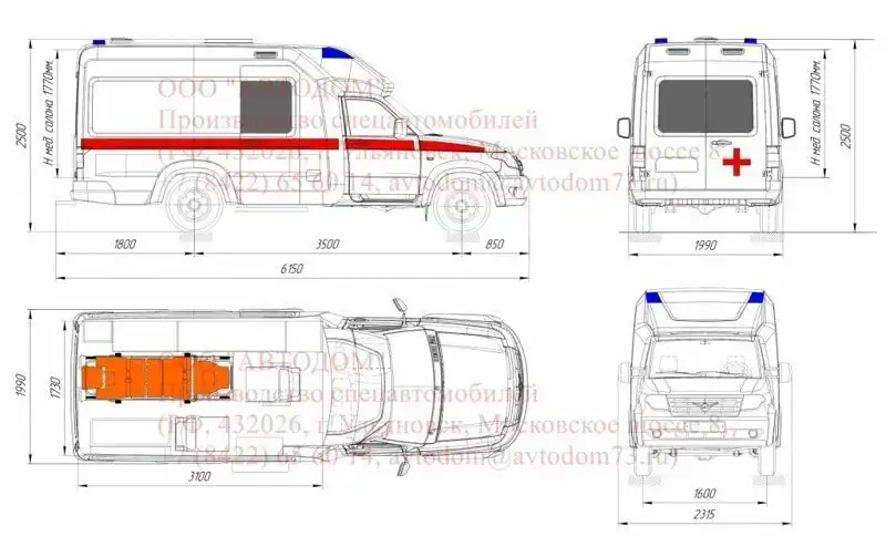 Длина, ширина, высота медицинского «Профи» составляют 6150, 1990 и 2500 мм соответственно. Колесная база — 3500 мм (как у стандартного Profi). Скорая помощь выпускается в трех версиях — класса A, B и C (классность зависит от оборудования).
