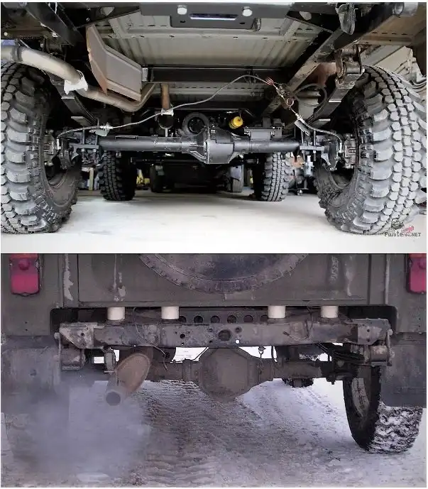 Но самое основное и дорогостоящее отличие заключается в мостах. На УАЗ ставилось два основных вида мостов, так называемый "военный или редукторный" и "гражданский". Военный мост отличается от "колхозного" расположением редуктора, бортовой редуктор из-за своей конструкции расположен сильно выше. Также отличается передаточное число редукторов - 5,38 на военном против 4.6 или 5.125 у гражданского. Заменить гражданский мост на военный без переделок нельзя, отличается длинна карданного вала, сошки, подвеска и так далее, но, если есть прямые руки и инструмент, то это конечно не проблема.