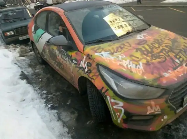 Автор этого поста пишет, что собрался прокатиться на автомобиле каршеринга, но подойдя к автомобилю обнаружил, что кто-то уже решил добавить ей красок.