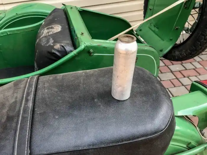 В багажнике коляски нашелся алюминиевый балончик с зеленой краской для мелких косметических подкрасов, а вот насос и комплект инструмента до наших дней не сохранились.