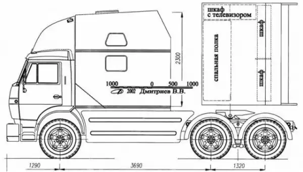 Автором этой кабины была компания РИАТ, известная прежде всего производством высоких крыш для КАМАЗов с заводскими кабинами. С этим КамАзом компания РИАТ пошла намного дальше, создав двухметровый спальник, с интерьером напоминающим небольшой кемпер.