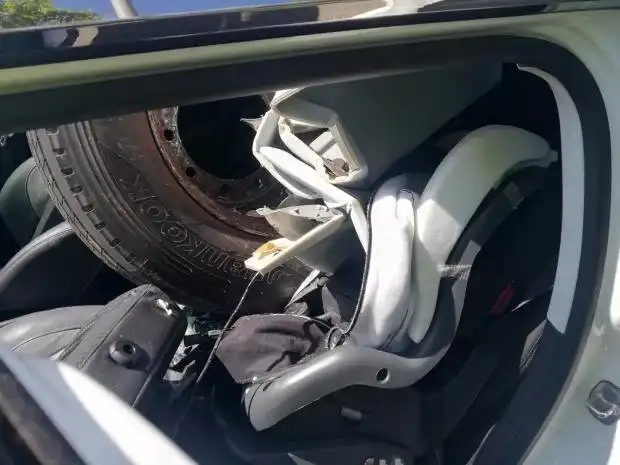 На юге Англии у грузовика на ходу отвалилось колесо и, перепрыгнув разделительные троссы, влетело в Peugeot на встречной полосе. Невероятно, но водитель легковушки отделался всего парой царапин.