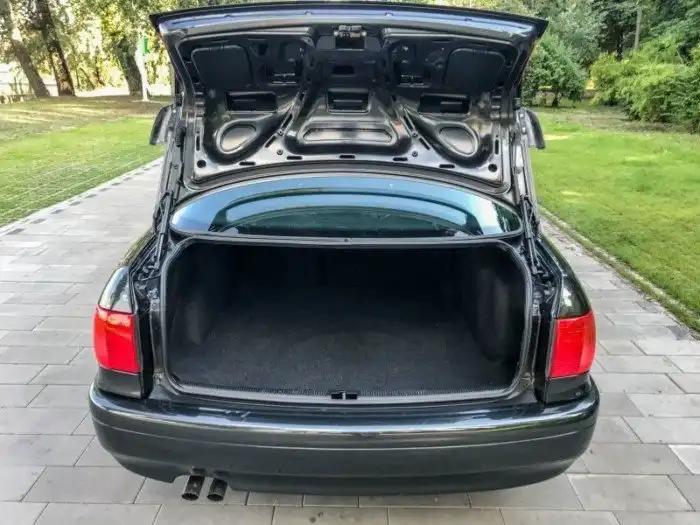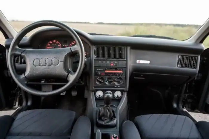 Состояние данной машины — просто изумительное. Даже запасное колесо в багажнике еще на новой заводской резине и ни разу не доставалось. Кузов весь в родной краске, а в салоне есть даже фирменные резиновые коврики еще тех лет — со старой эмблемой Audi.