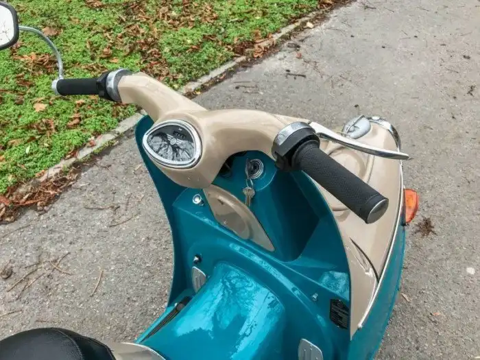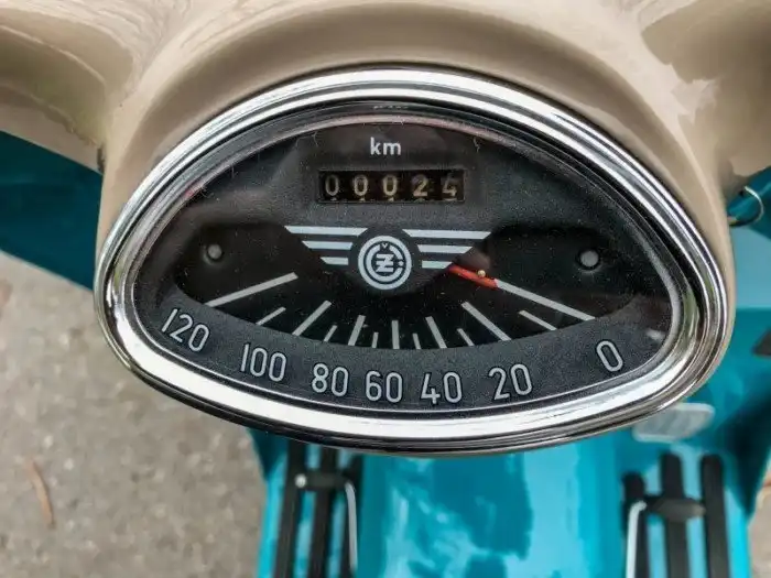 Cezeta 501 оснастили круглым спидометром и довольно большими 12-дюймовыми колесами, что было не очень характерно для скутеров. Силовой агрегат кстати тоже размещен не по-мотороллерному – на качающемся рычаге подвески, а по-мотоциклетному – на несущей конструкции аппарата. Через год над бензобаком установили багажник, а замок зажигания перенесли на верхнюю часть щитка ближе к спидометру.