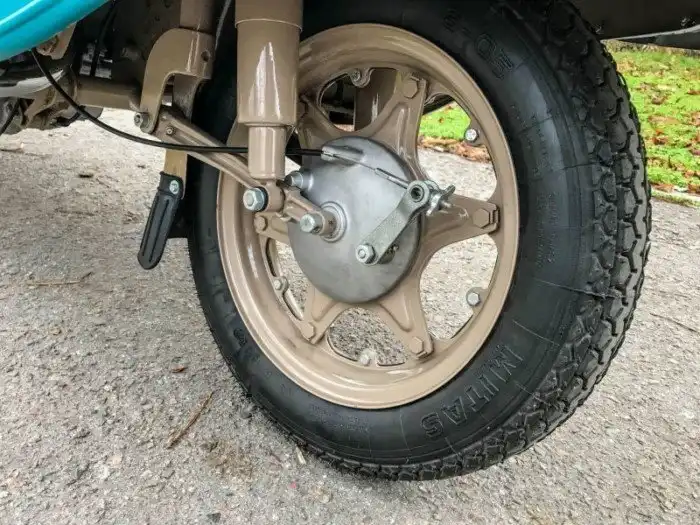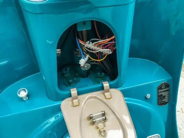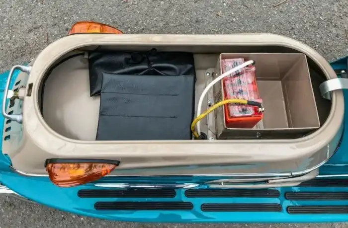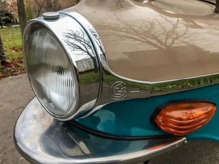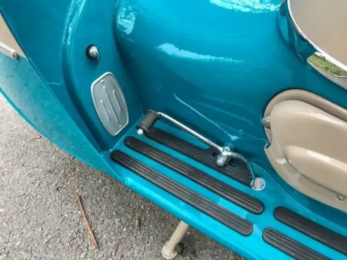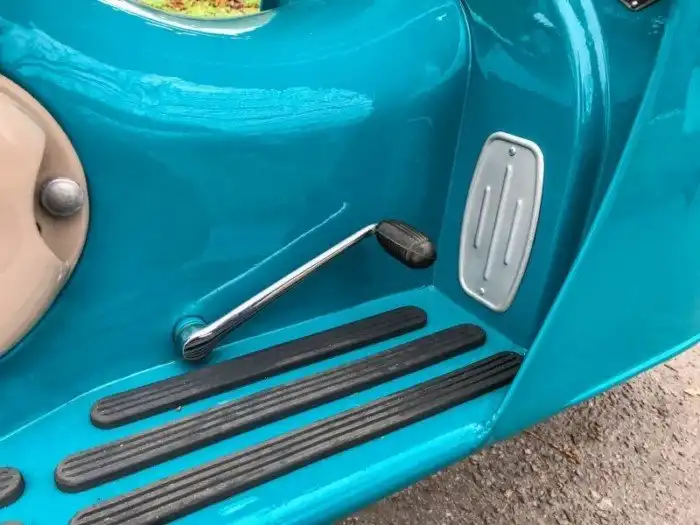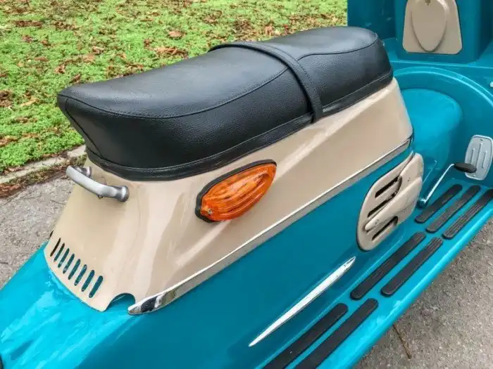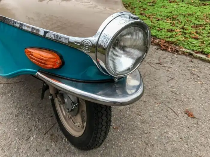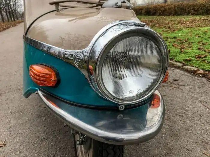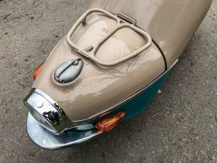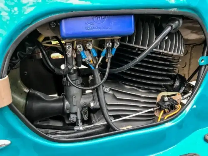 На фото представлена модификация 502/05 образца 1964 года. Одноцилиндровый двухтактный (9,5 л.с. при 5 000 об/мин) мотор Cezeta запускается династартером – генератором, совмещающим в себе функцию стартера. На случай севшего аккумулятора можно воспользоваться съемной педалью кикстартера, которая спрятана в багажнике под сиденьем.