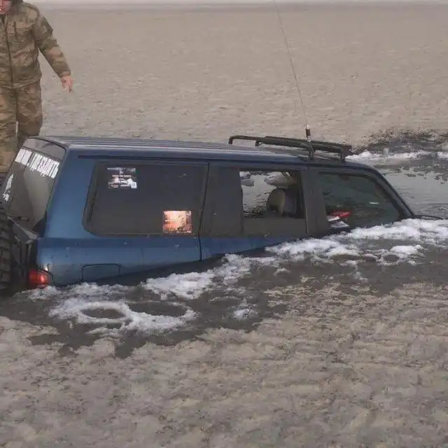 Отечественная Нива провалилась под лед Таганрогского залива после того, как водитель решил провести тест-драйв. Тонкий лед оказался слабее, поэтому машина перешла в разряд «утопленницы».