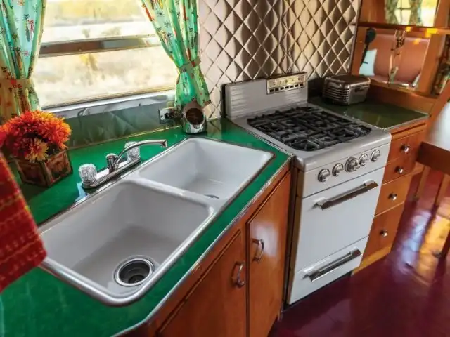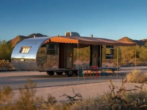 Долгое время трейлер восстанавливали — как внутри, так и снаружи. Его оснастили внешним тентом и набором стульев и столиков для отдыха на открытом воздухе. Весь корпус и баллоны с пропаном отполировали, что придало кемперу более стильный внешний вид.