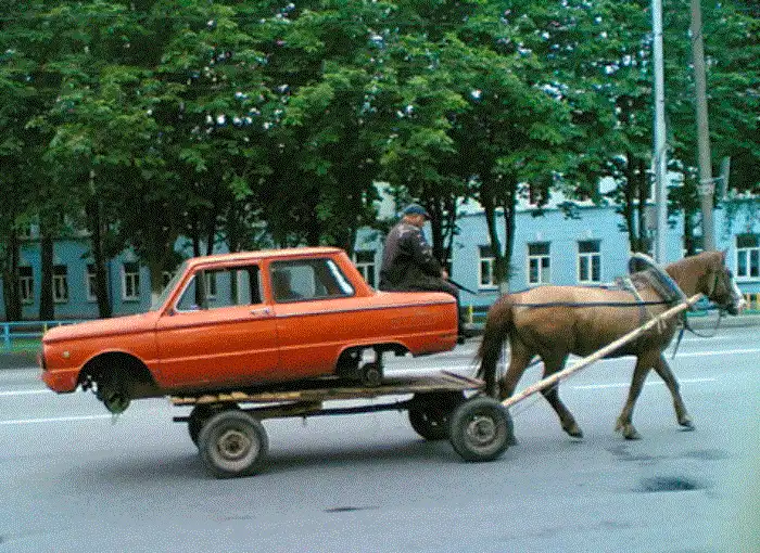 2. Он не единственный рукодельник, соединивший авто не на ходу и лошадь