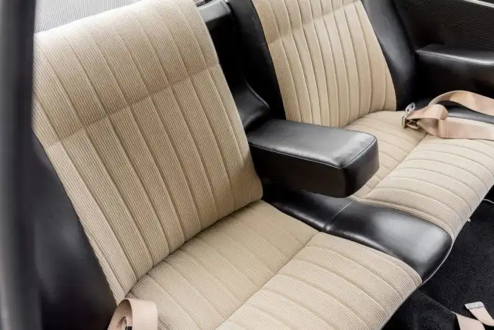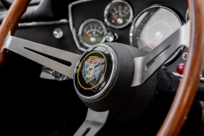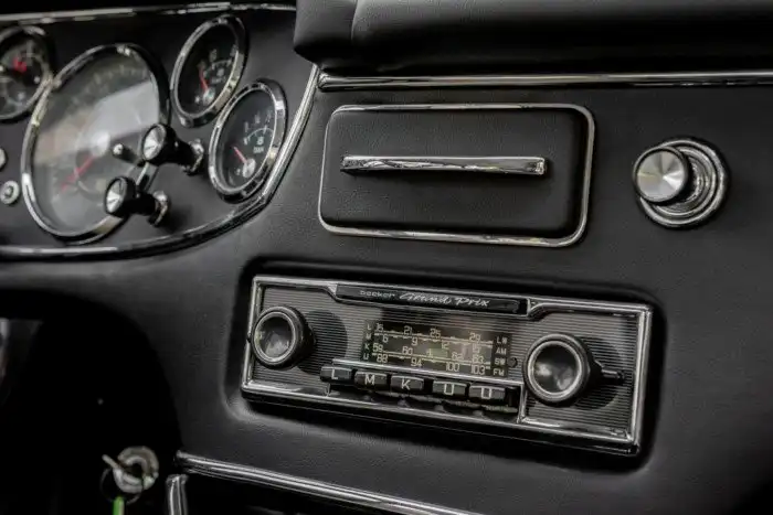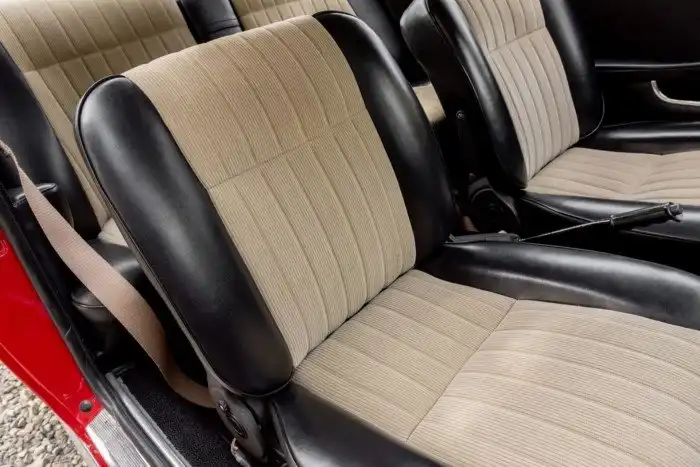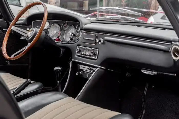 Салон выполнен в двух цветах, получаемых из сочетания черного винила и бежевого вельвета. Помимо обычного спидометра, тахометра и указателя уровня топлива, комбинация приборов также включает датчики температуры масла, температуры воды и давления масла. А еще тут есть ремни безопасности, печка и трехдиапазонное радио Becker Grand Prix.
