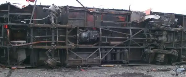 Чтобы ответить на этот вопрос, нужно пройти к самому ЛиАЗу. Вот собственно и он. Лежит на боку, правда уже без двигателя. Но давайте представим, что V8 у него на месте, по центру в передней части. Итак, что же мы тут видим?
