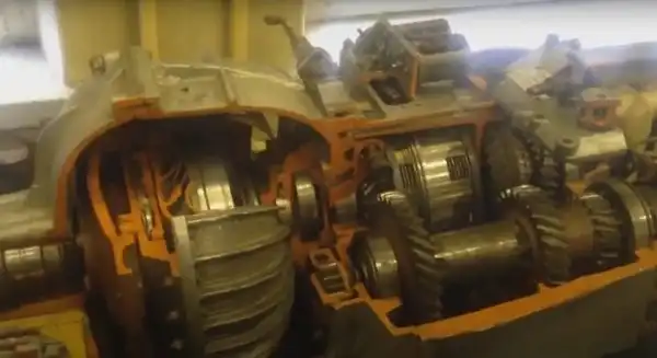 А видим мы здесь, как гидромеханическая коробка передач значительно отдалена от самого двигателя. Она вынесена в базу и находится между передним и задним мостом. Соединяется её первичный вал с валом двигателя аж через два карданных вала. Видели когда-нибудь такое?