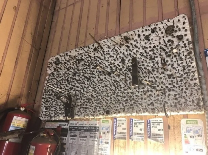 13. Когда хозяин шиномонтажа коллекционер и собирает все инородные предметы, которые были извлечены из покрышек