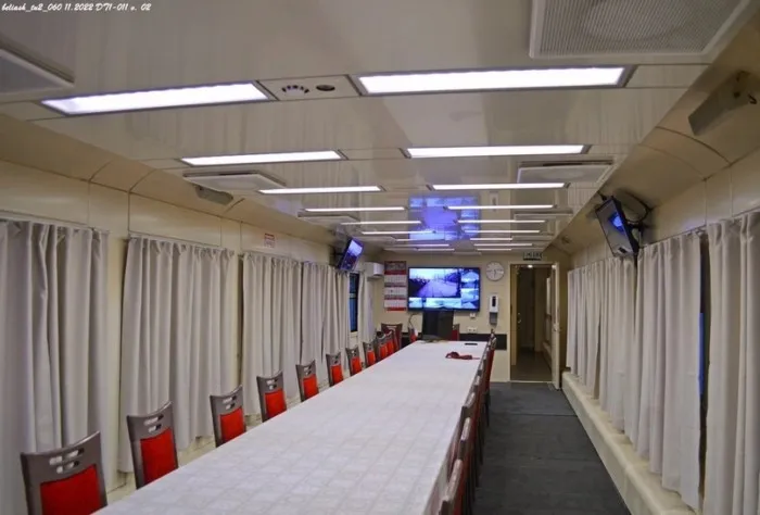 Как "членовозы" выглядят внутри? В сети можно найти несколько фото. Как правило, в поезде присутствует конференц-зал, душ, кухня, купе для отдыха и просторная кабина для осмотра путевого и станционного хозяйства.
