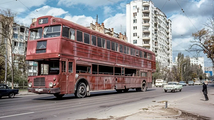 Попросил нейросеть изобразить советский двухэтажный автобус, сделав фото в стиле 80-х. Причудливые конструкции - в фотогалерее: