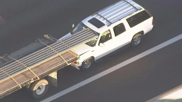 10. Стальная балка упала с грузовика, отскочила и врезалась в BMW. Произошло это в Сан-Хосе, штат Калифорния. Водитель в порядке, отделался царапинами