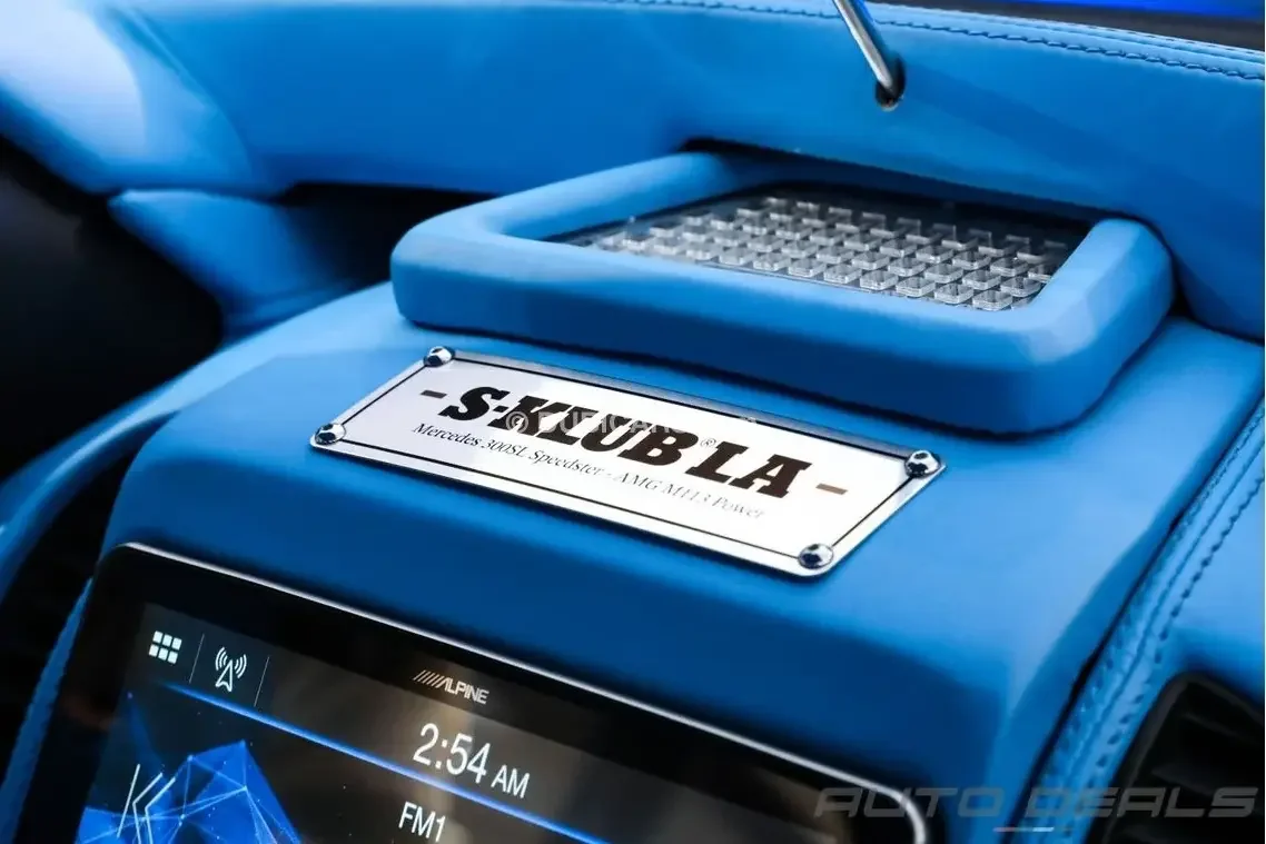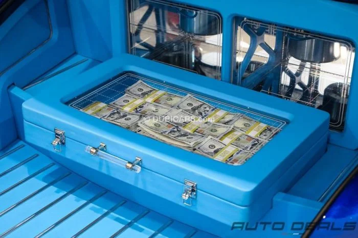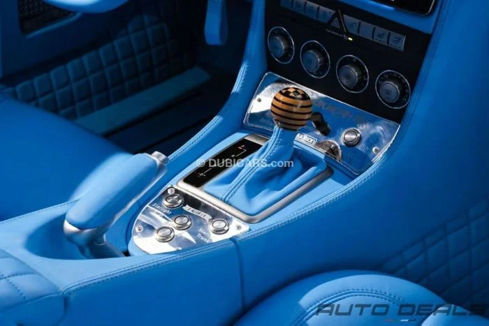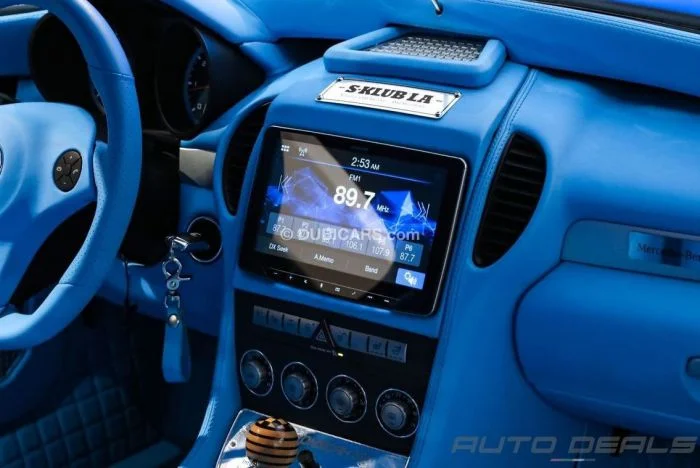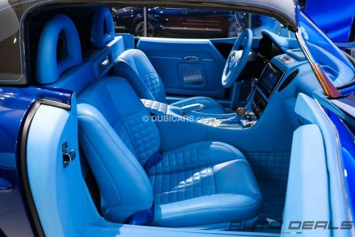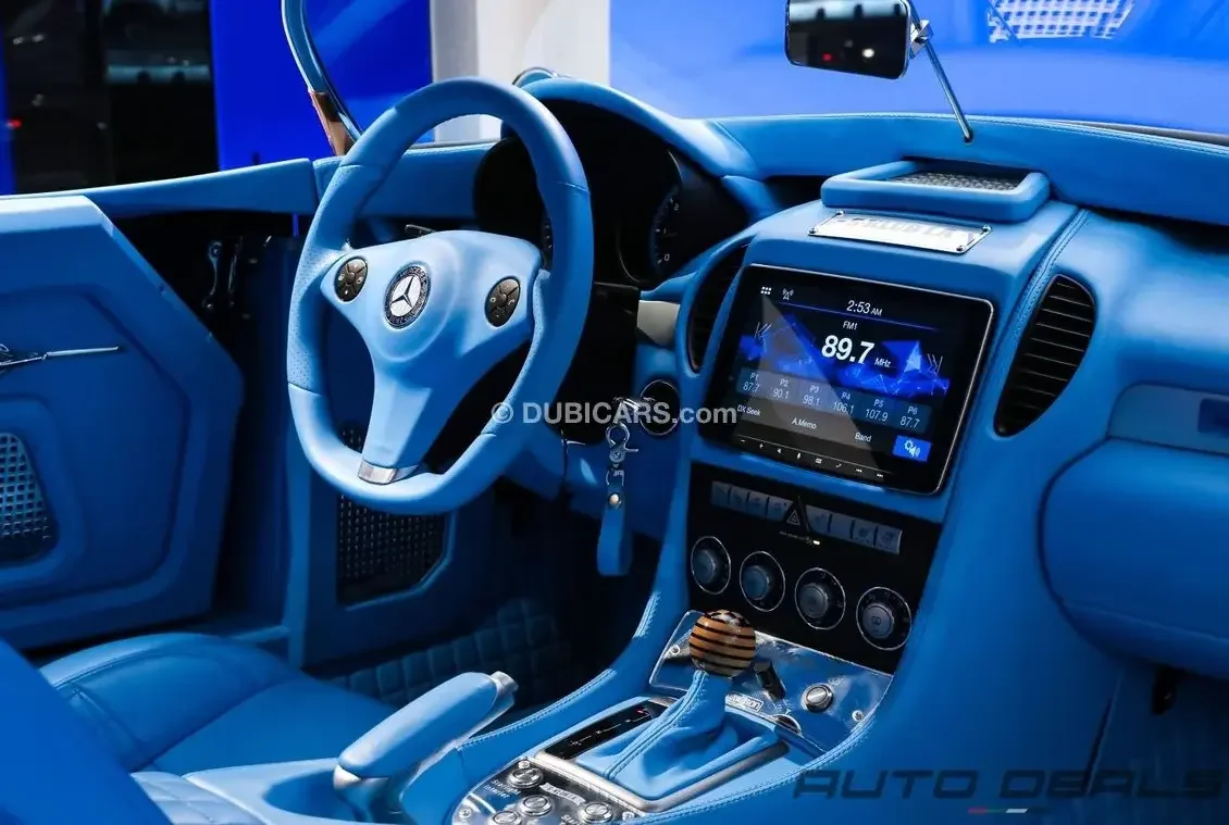 Интерьер спорткара в целом сохраняет черты донорской модели — SLK 55 AMG начала двухтысячных — но полностью отделан заново и дополнен некоторыми чертами наподобие оригинального набалдашника селектора коробки и современной медиасистемы от Alpine. Кроме того, салон кастома украшен множеством подсвеченных элементов. На приложенных к объявлению фотографиях чемодан в багажнике запечатлён наполненным купюрами. Продавец не уточняет, настоящие ли они.