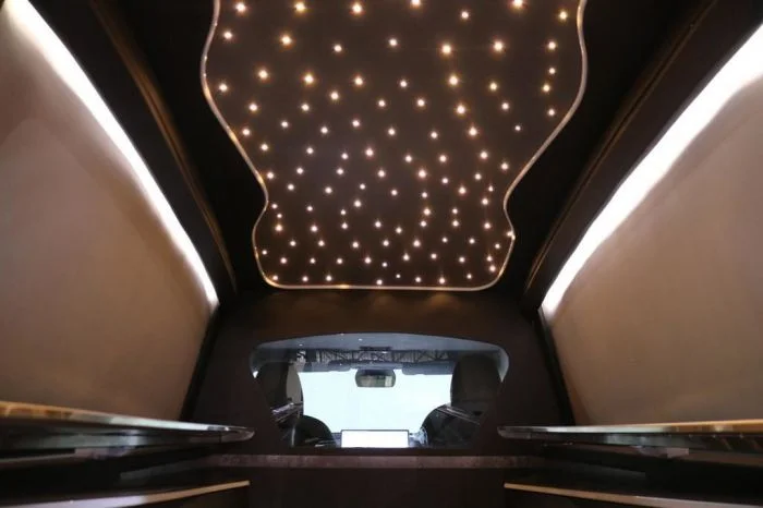 В салоне передняя часть отделена от отсека для перевозки гроба перегородкой со стеклом. В отделке использовано дерево, на потолок добавлена подсветка в духе Rolls-Royce.