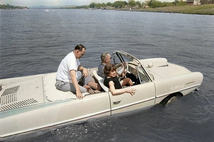 Линдон Джонсон — 36-й президент Соединённых Штатов Америки. Как в воде, так и на суше Амфикар управляется передними колесами, что делает его менее маневренным, чем обычную лодку.