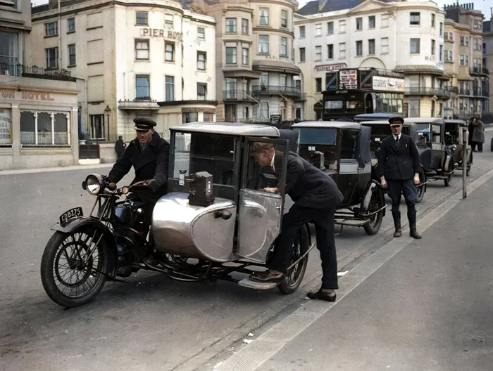 Мотоциклы с закрытой коляской, использовавшиеся в роли такси в городе Брайтон. Англия, 1930 год.