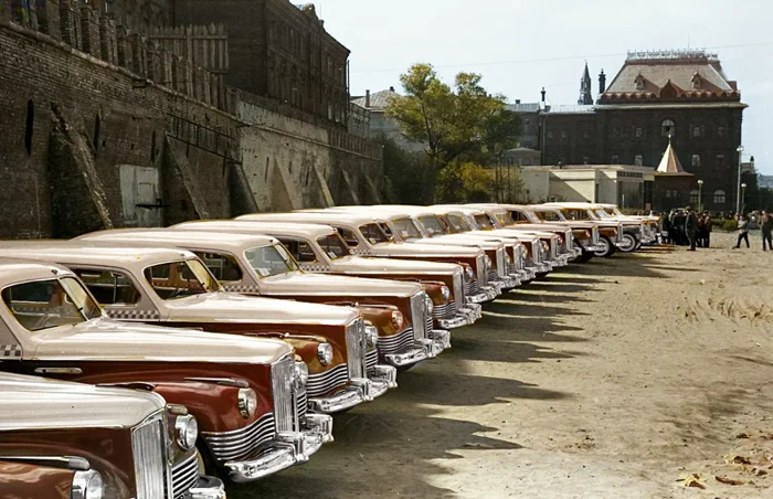 Стоянка такси (ЗИСов) у Китайгородской стены». Москва, 1950-е годы.