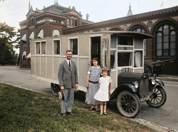 Это модель 1920 годов. Пока ещё самострой. Но уже в это время число коммерческих производителей перевалило за десяток и начали выпускать специализированный журнал посвященный домам на колесах.