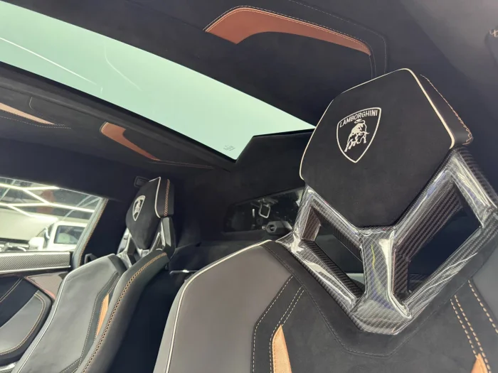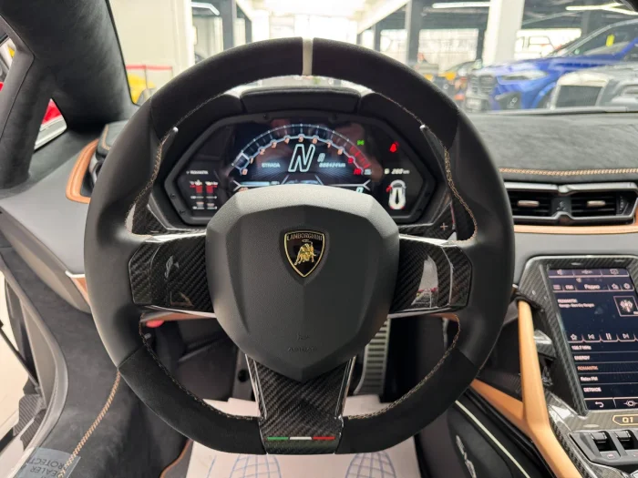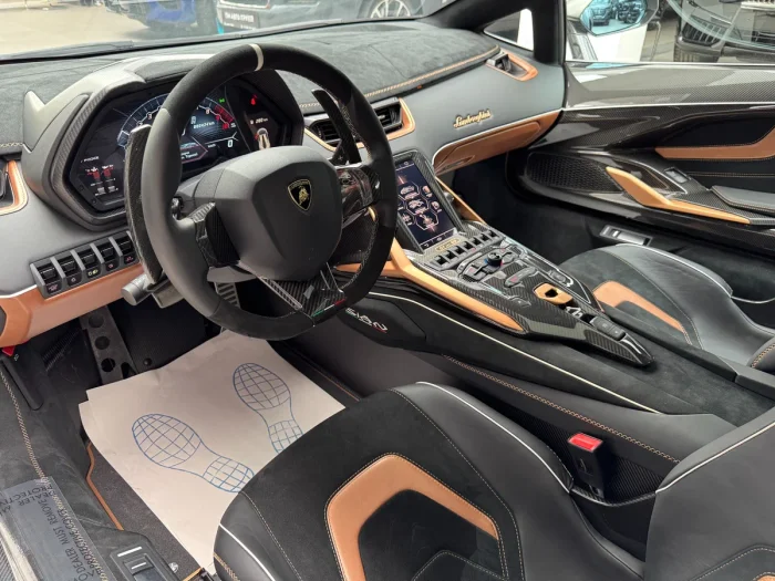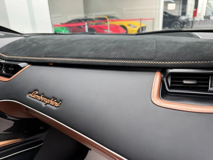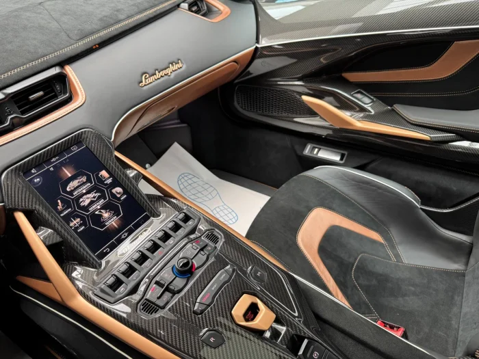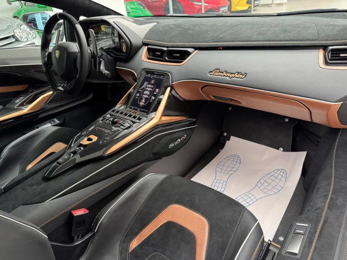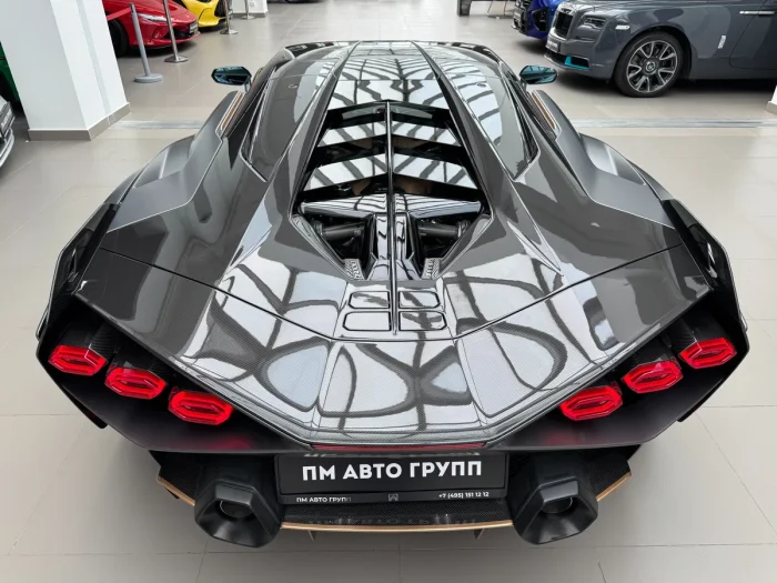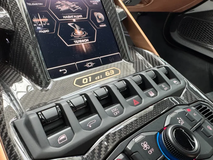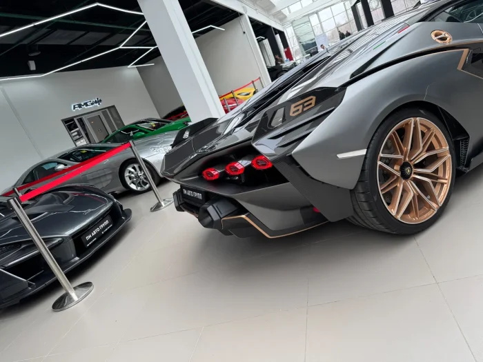 Все экземпляры Lamborghini Sian были изготовлены по индивидуальным заказам. Представленная в Москве машина окрашена в серый матовый цвет с золотистыми акцентами и имеет гоночный номер 63 на кузове. Интерьер выполнен из кожи, алькантары и карбона в той же цветовой гамме.