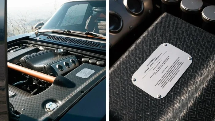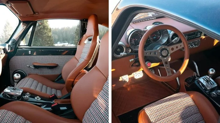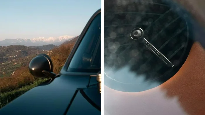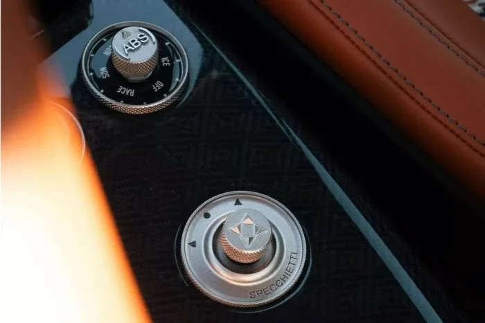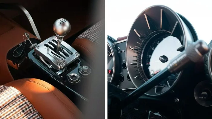 Кузов GT Super Jarama, выполненный из углепластика, установлен на алюминиевом шасси, покрыт глубоким синим оттенком Blu Cervino и украшен фирменными эмблемами, созданными с ювелирной точностью. Интерьер, обшитый высококачественной кожей Connolly Cognac, дополнен анодированным алюминием и карбоновыми элементами. Два винтажных хронографа Tag Heuer и рычаг переключения передач с открытым механизмом напоминают о спортивных традициях.