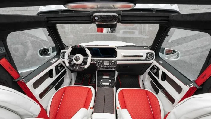 Интерьер демонстрационной модели выполнен в красно-белой гамме, что гармонирует с цветовым сочетанием кузова и тканевого верха. Среди значительных изменений в салоне выделяются отделка кожей и карбоном, индивидуальные кресла на заднем ряду, а также новое рулевое колесо с ярко выраженными спортивными чертами.