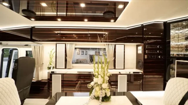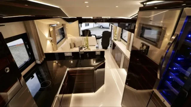 Изначально автодом Performance S был разработан как роскошное мобильное жилище для семьи с двумя детьми. В его интерьере представлен индивидуальный дизайн, сочетающийся с высококачественными материалами отделки и эксклюзивной мебелью, изготовленной из ценных пород дерева специально для этого дома на колесах. Одним из заметных элементов интерьера является домашняя акустическая система от известного бренда Burmester, стоимость которой составила 300 тысяч долларов. Этот уровень роскоши и внимания к деталям делает автодом Performance S уникальным и привлекательным предложением на рынке мобильных жилищ.